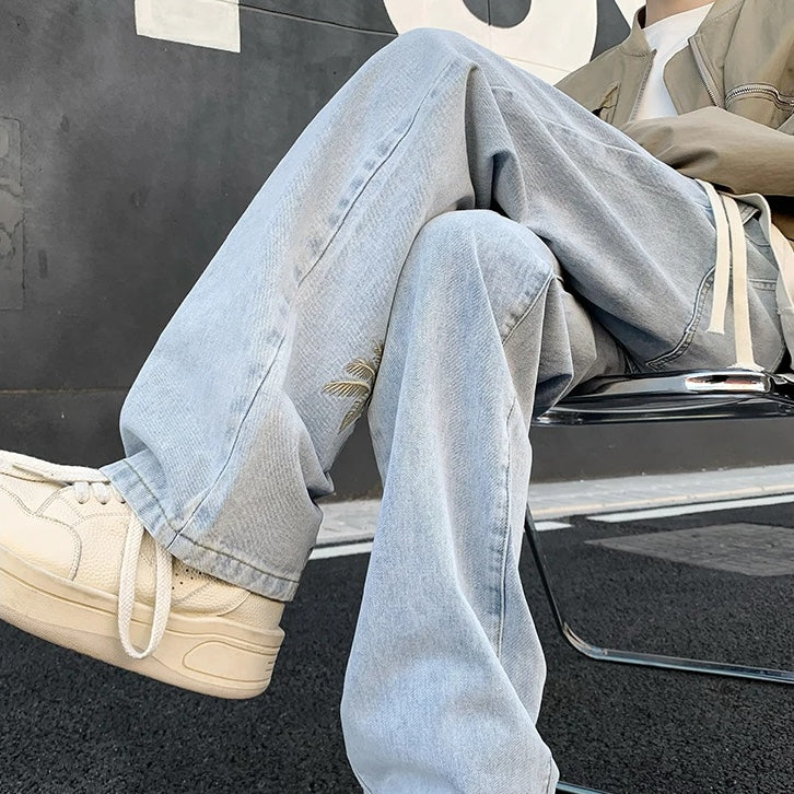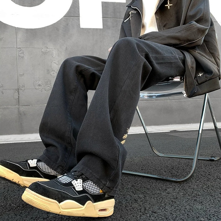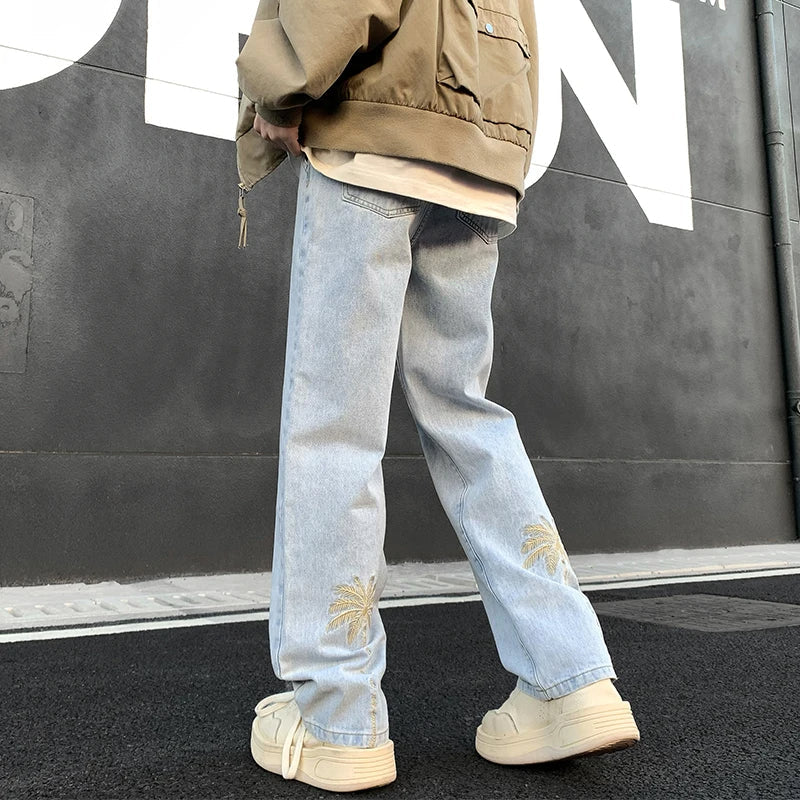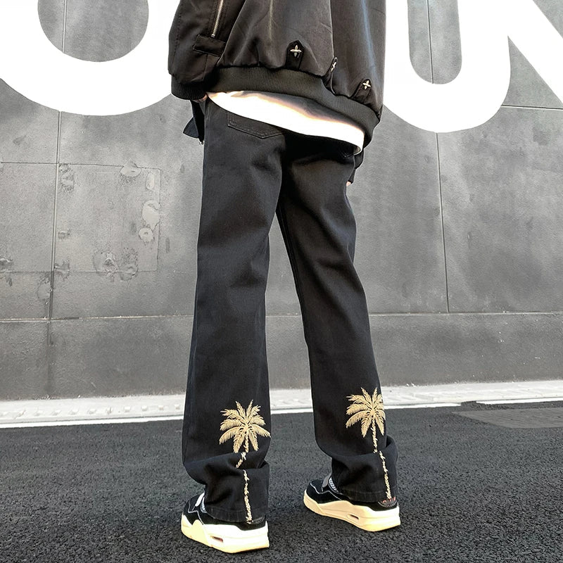 Soak in sunshine and beach vibes in these relaxed-fit denim joggers, detailed with golden palm tree embroidery at the ankle — summer's essence captured in every detail.