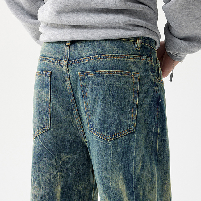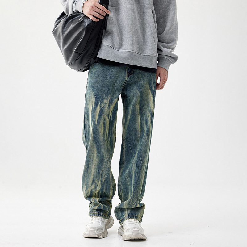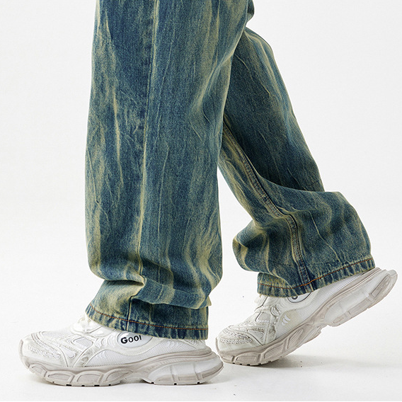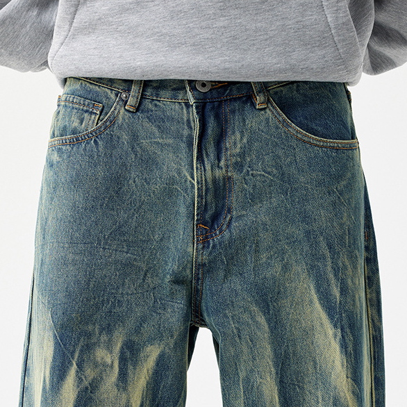 Sahara-like streaks create textured patterns across the denim in golden sand tones to these jeans. The relaxed fit and durable denim amplify their rugged, desert-inspired character.