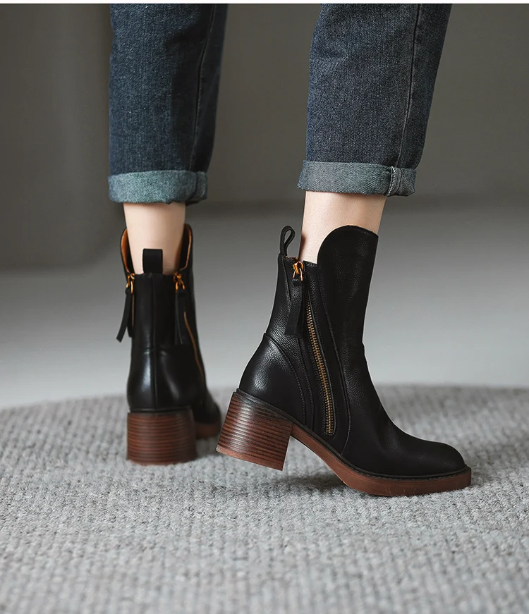 Crafted in smooth leather like material, the Clara has a round toe and a solid block heel for stable lift. A side zipper makes them easy to put on, and the cushioned insole keeps every step comfortable. Clean stitching and a timeless shape give this boot everyday versatility.