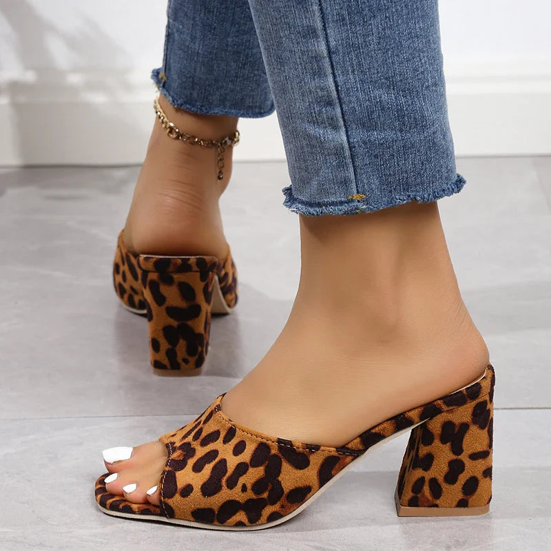 These leopard print sandals bring wild flair with an open square toe for women. Chunky high heels shape their slide-on style, perfect for parties or bold nights out. Fierce and comfy, they’re your go-to statement shoes.