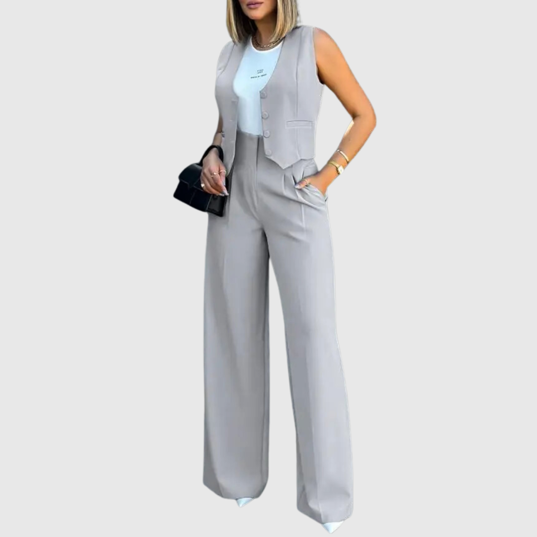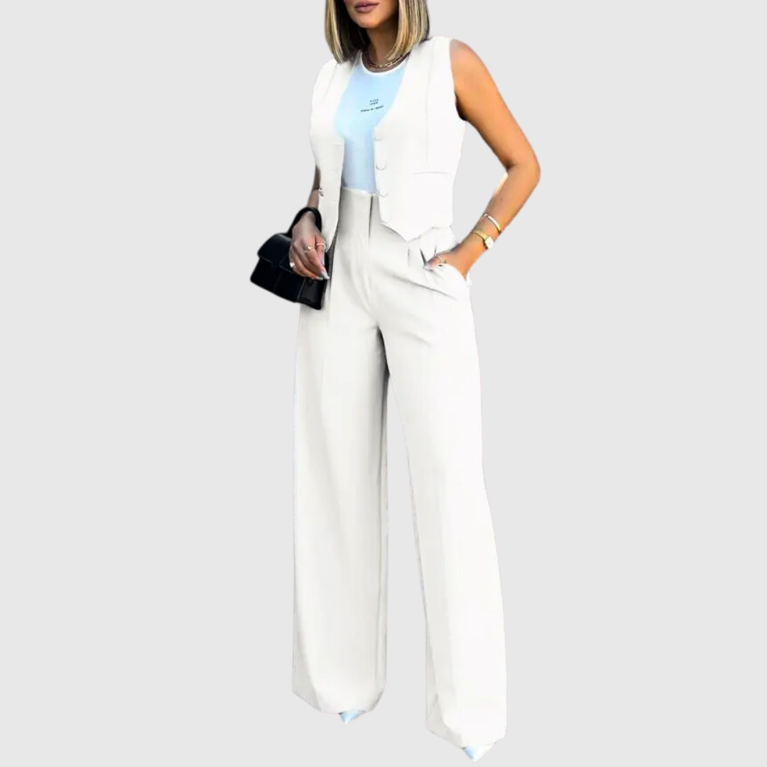 Crafted with a focus on comfort and sophistication, this versatile set features a sleek vest top with a flattering V-neck and button details, paired with a pair of wide-leg, high-waist pants.